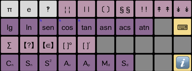 Tenen la denominació habitual, de manera que no necessiten aclariment. En prémer la tecla d'un valor constant o funció integrada s'afegeix una trucada al símbol, i segons el format, s'obren els parèntesis per indicar els paràmetres de càlcul o es posiciona el cursor d'inserció per indicar el paràmetre com subíndex.