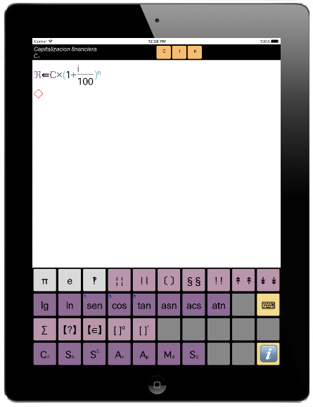 En prémer la tecla d'un valor constant o funció integrada s'afegeix una trucada al símbol, i segons el format, s'obren els parèntesis per indicar els paràmetres de càlcul o es posiciona el cursor d'inserció per indicar el paràmetre com subíndex.